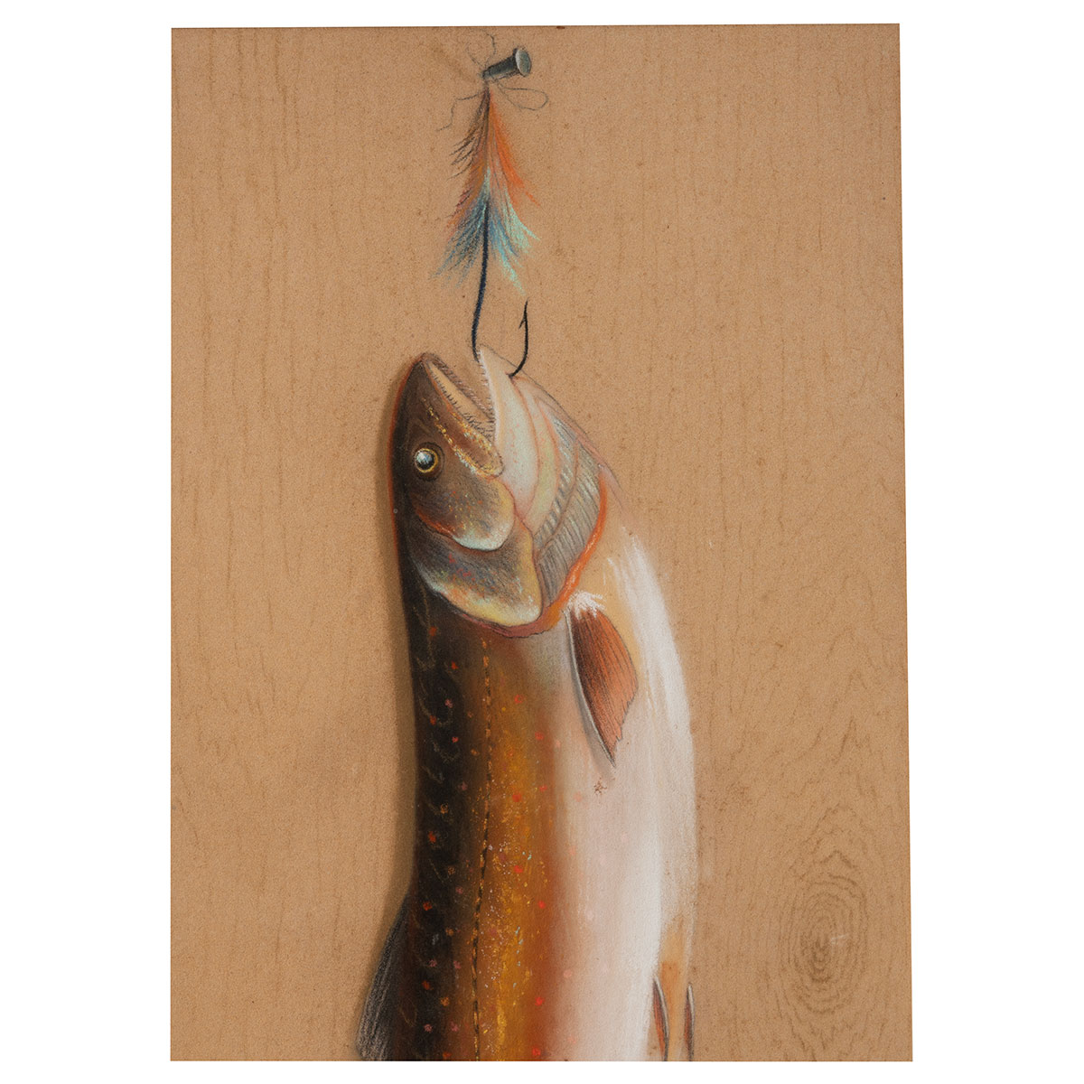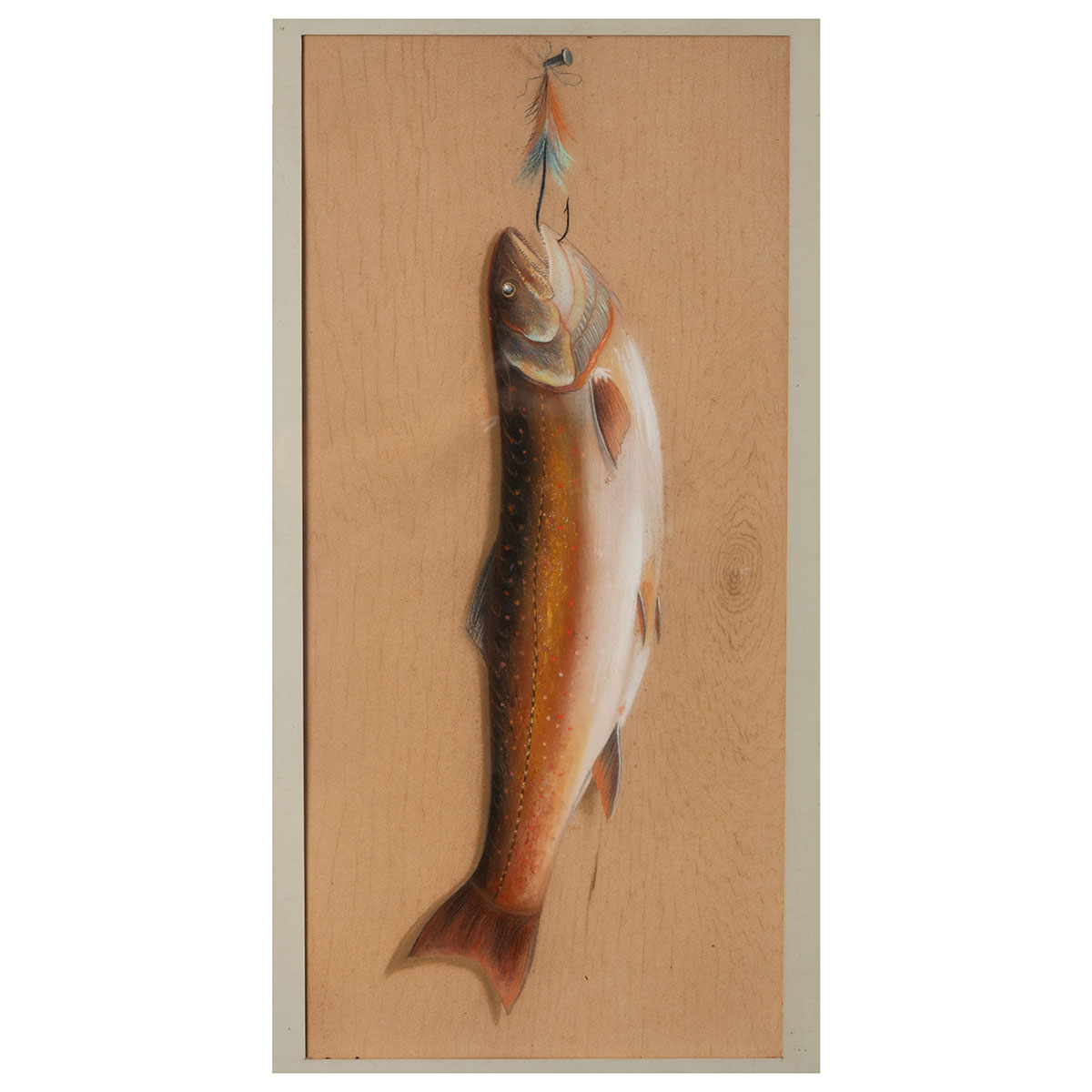 Antique Pastel on Paper Drawing of a Trout hanging from a Fishing Hook with a Fly Lure