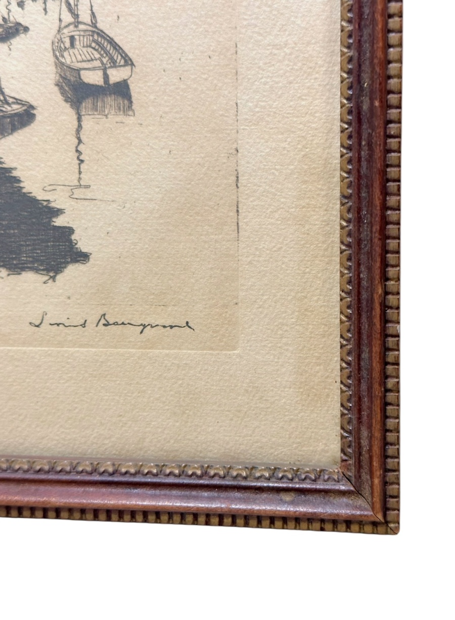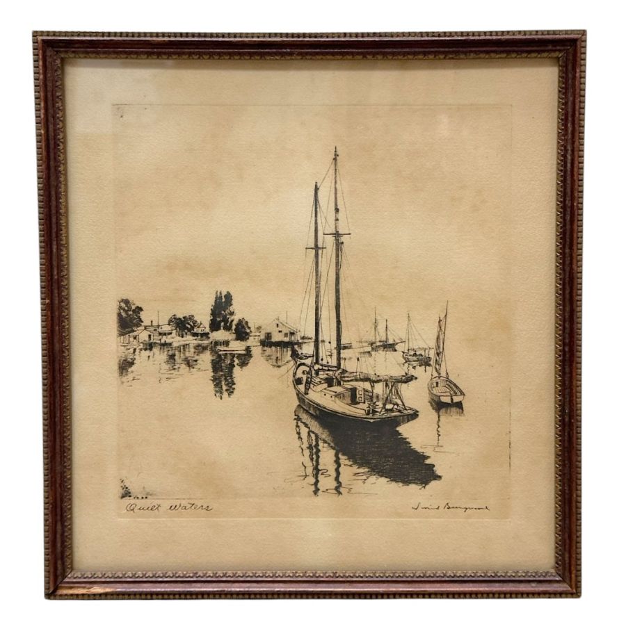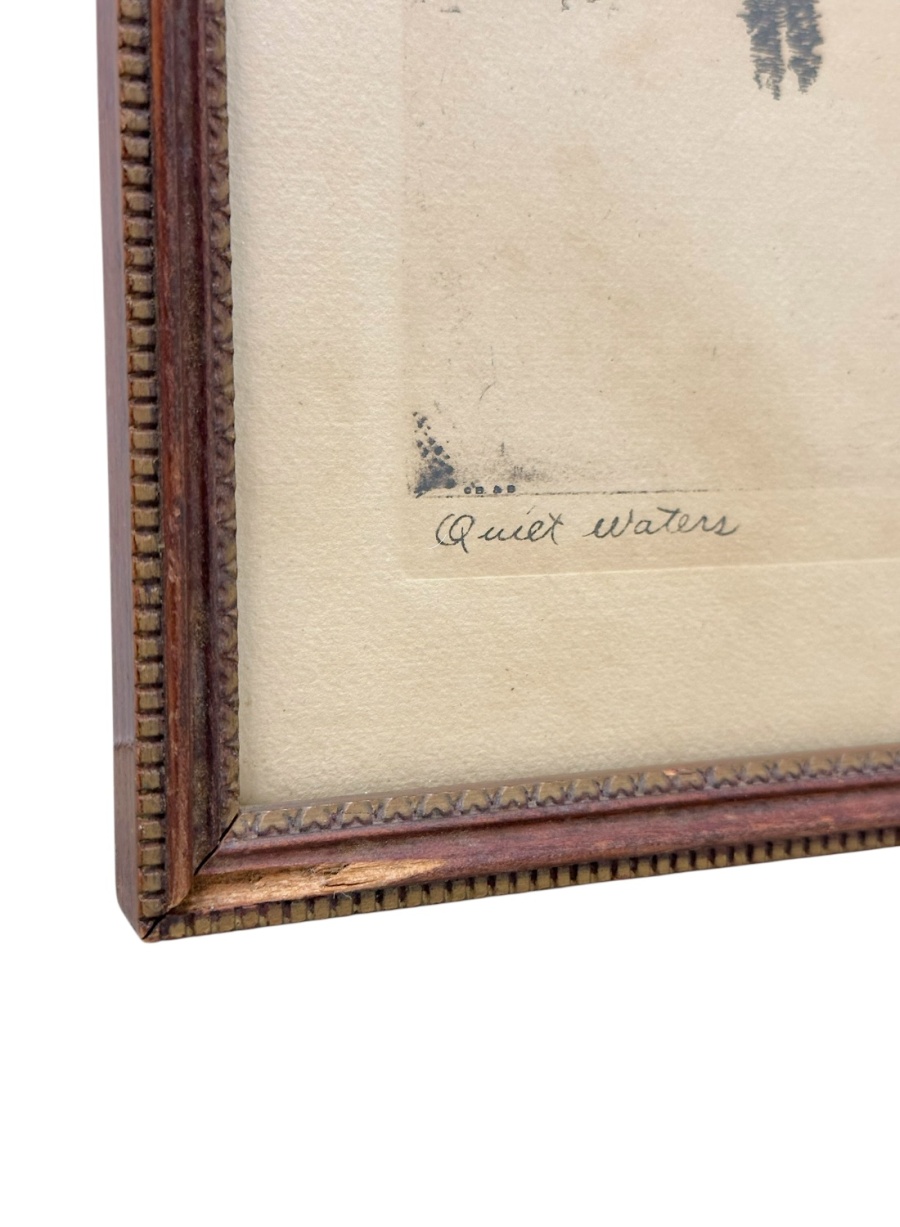 Vintage Framed Nautical Pen Drawing Titled “Quiet Waters”