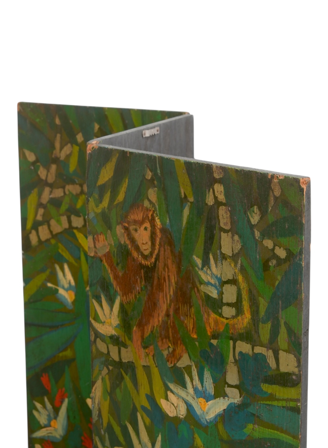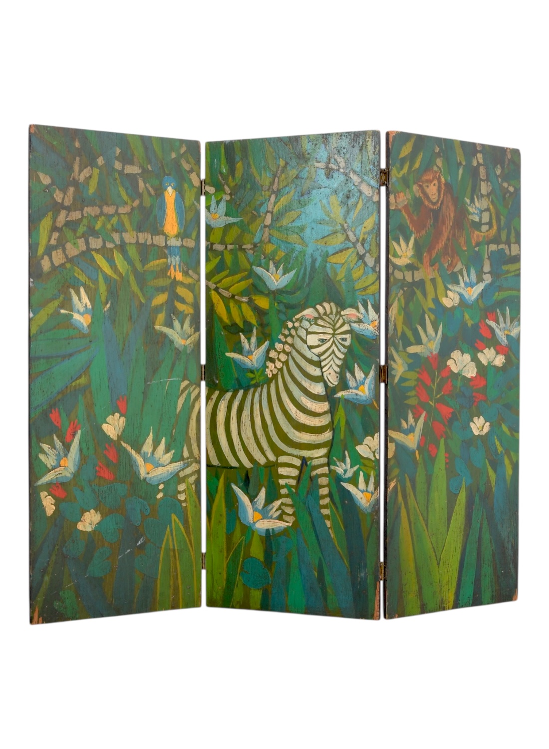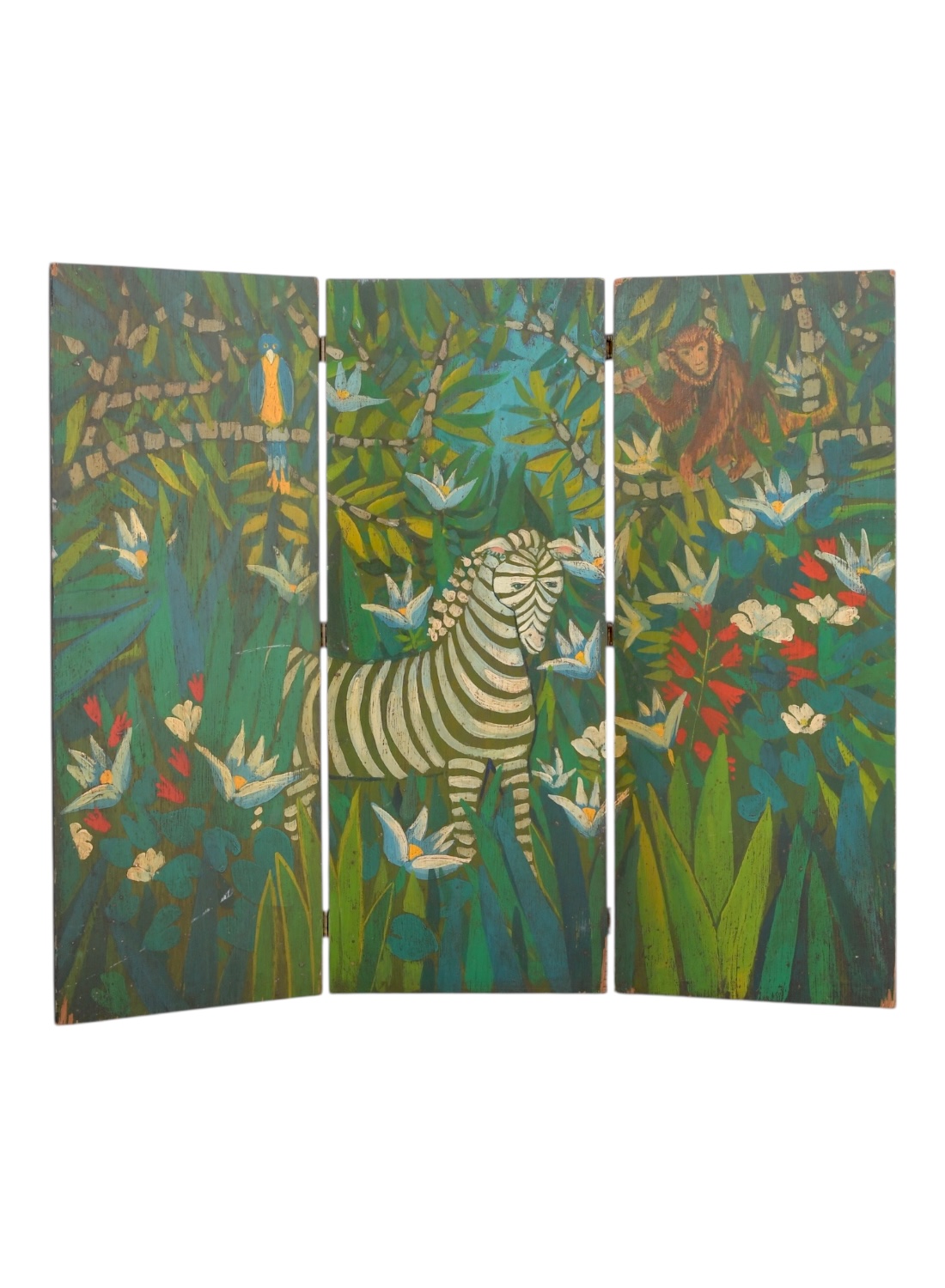 Vintage Hand Painted Folk Art Jungle Scene Tabletop Three Piece Folding Screen