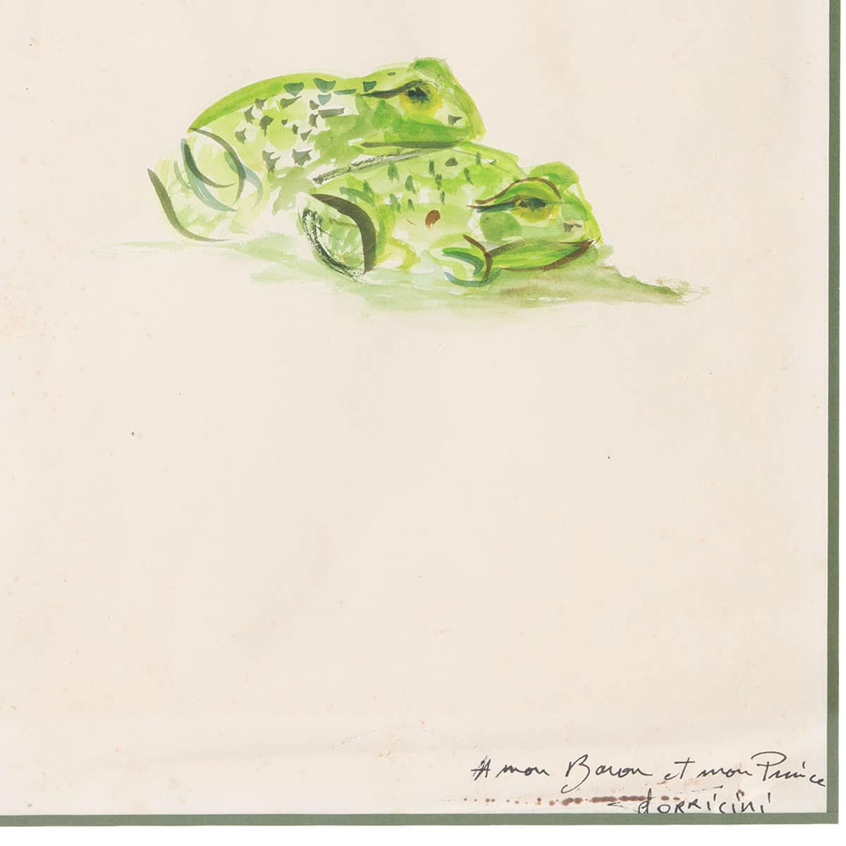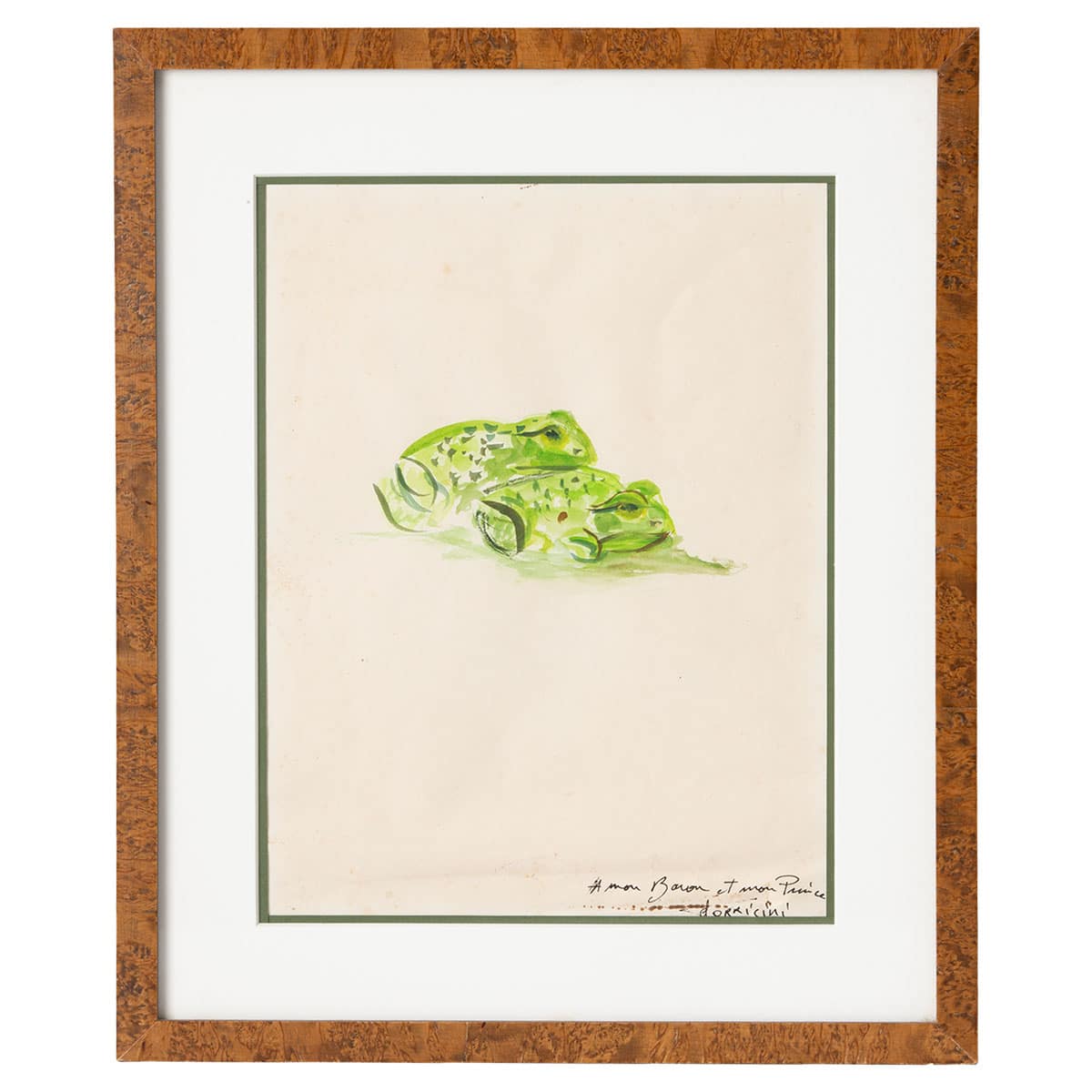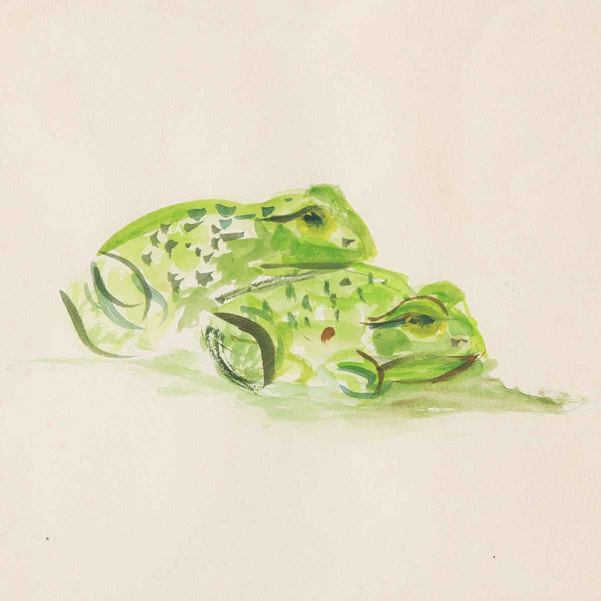 Vintage Hand Painted Watercolor of Two Green Frogs in Repose