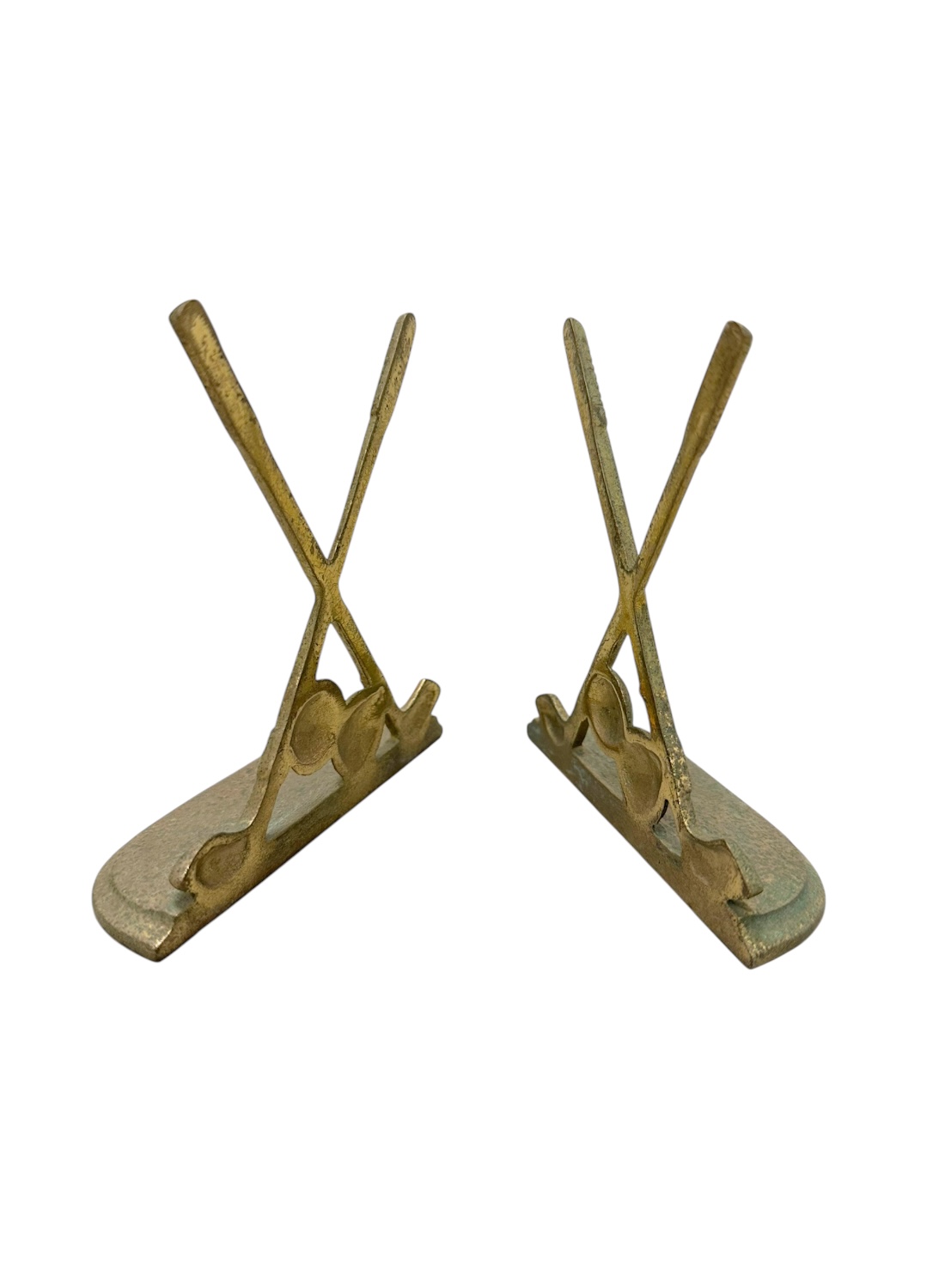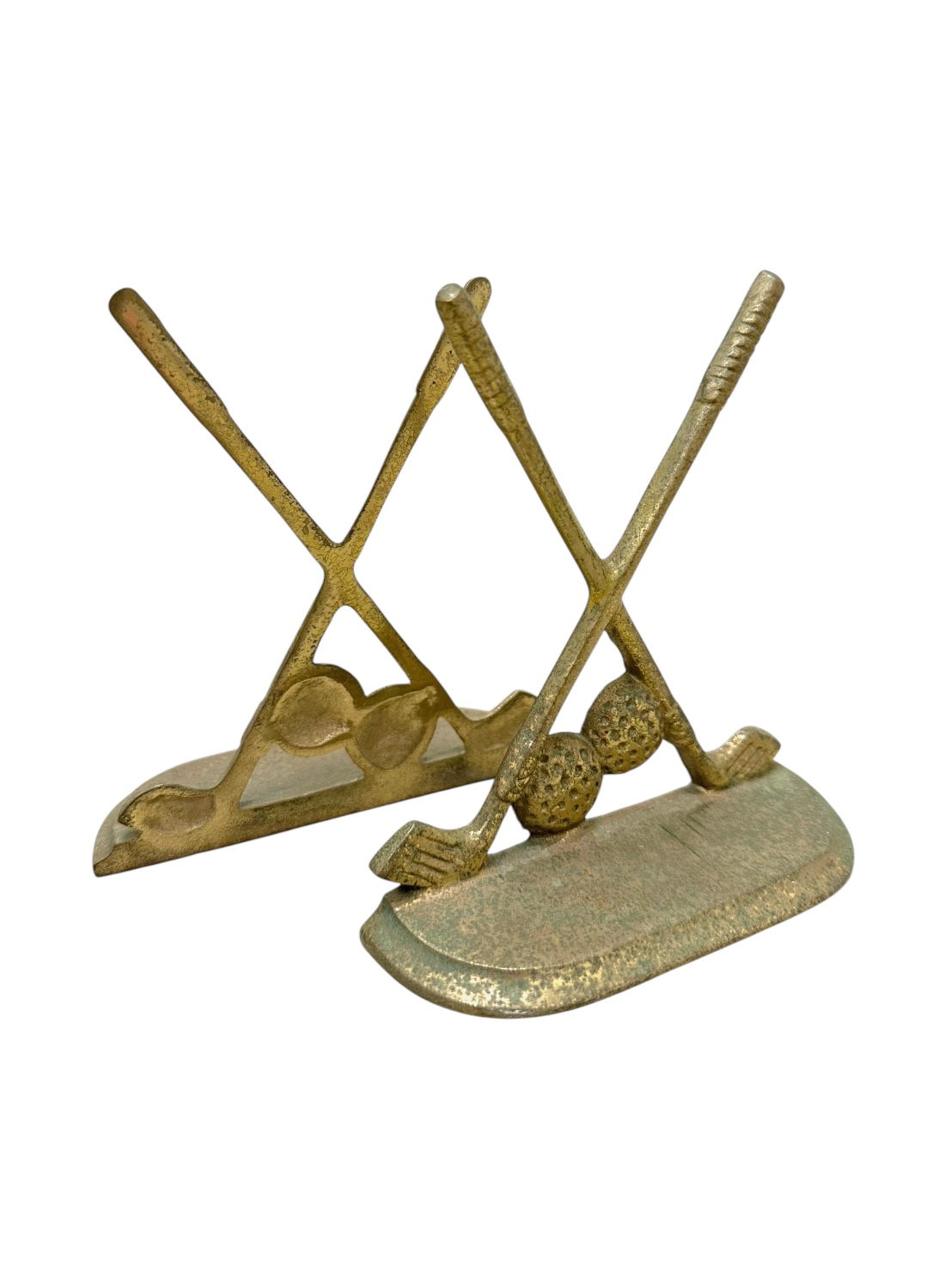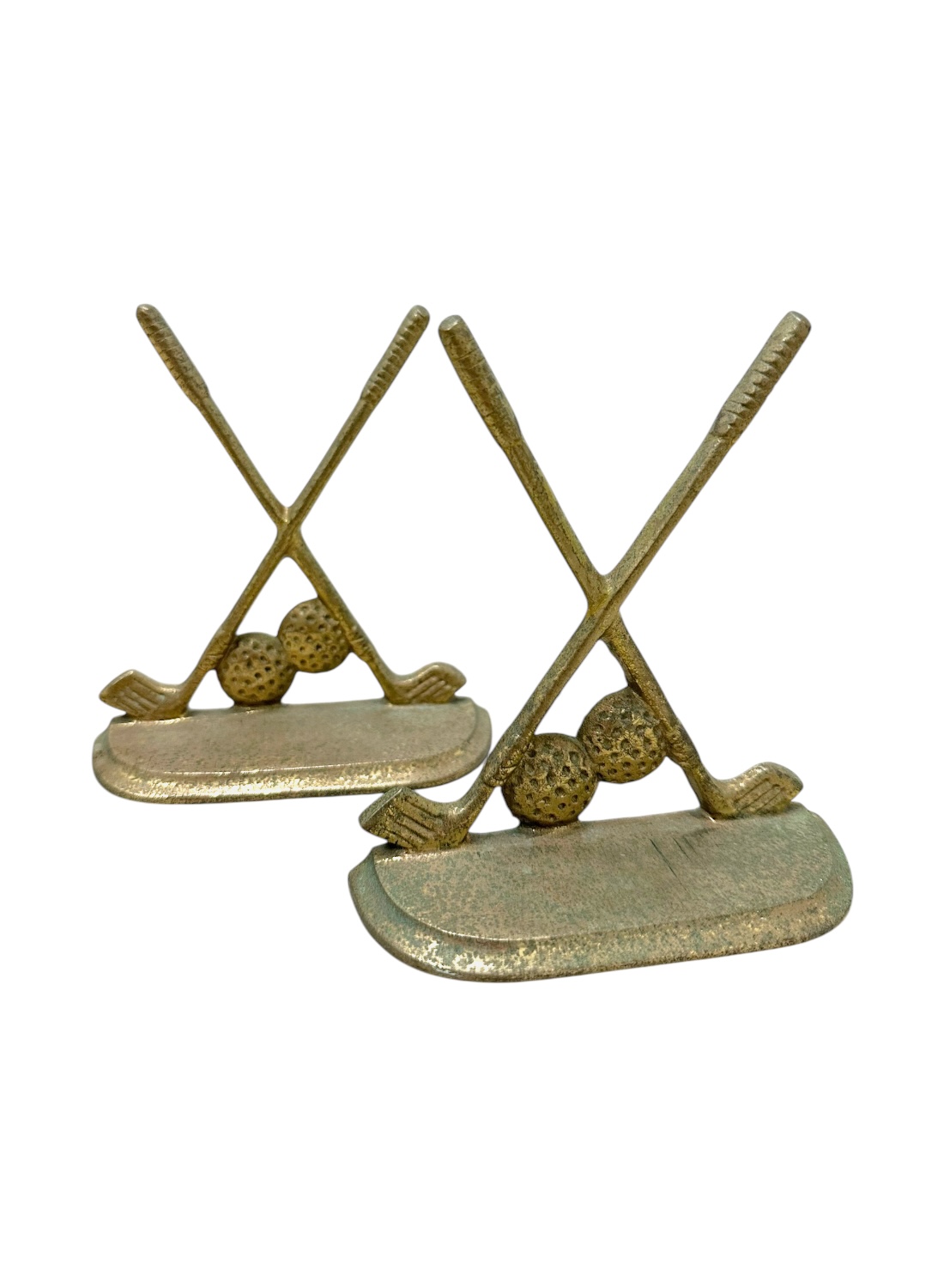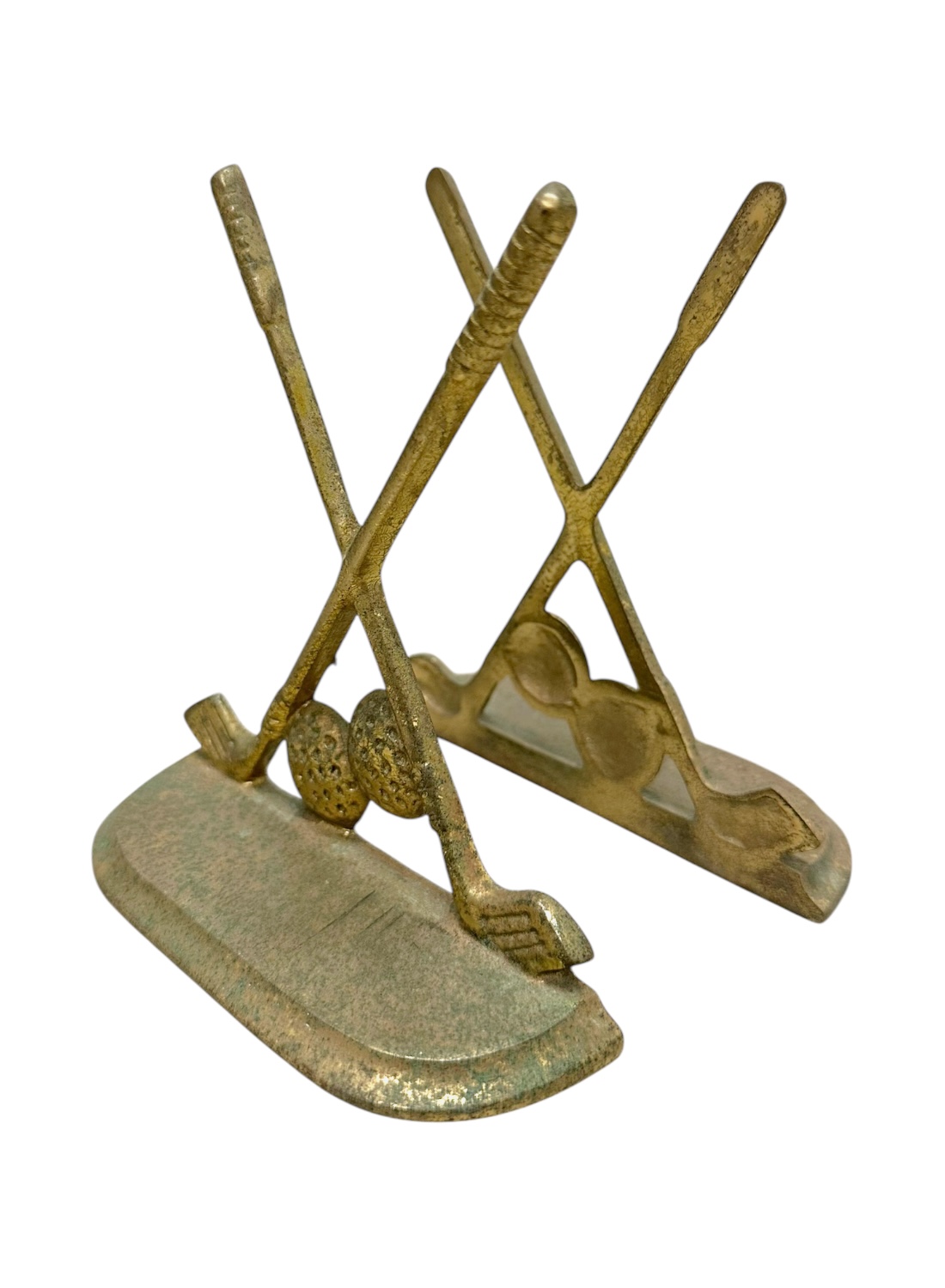 Vintage Pair of Brass Golf Club and Ball Bookends with Patina