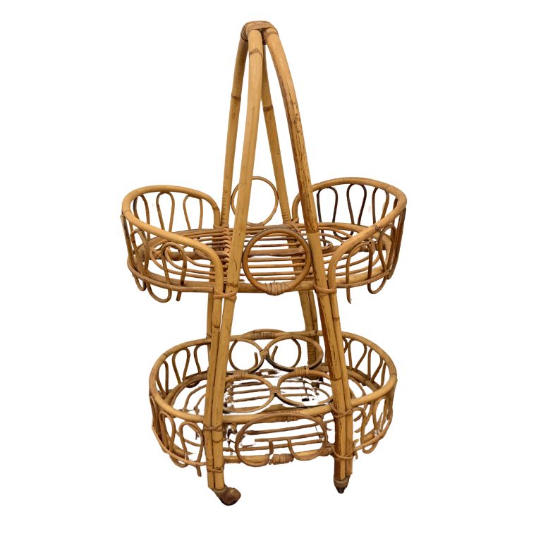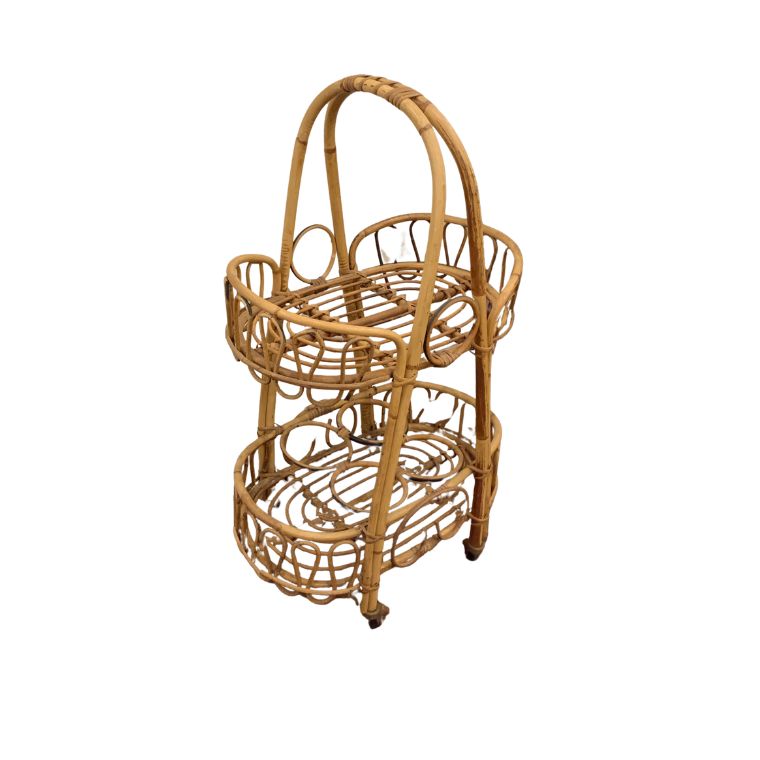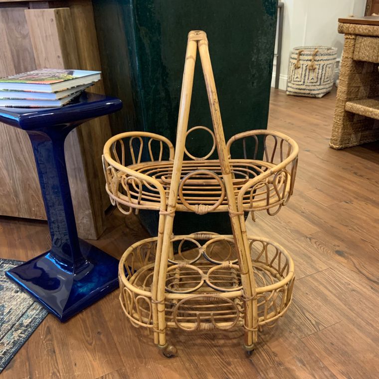 Vintage Low Rattan and Wicker Bar Cart on Casters