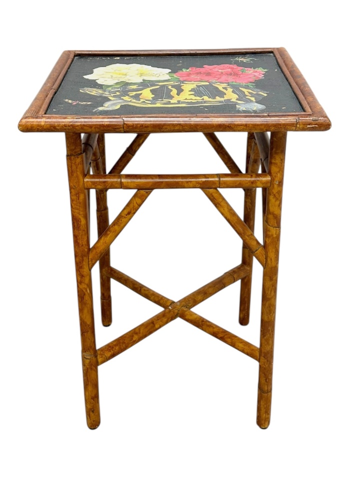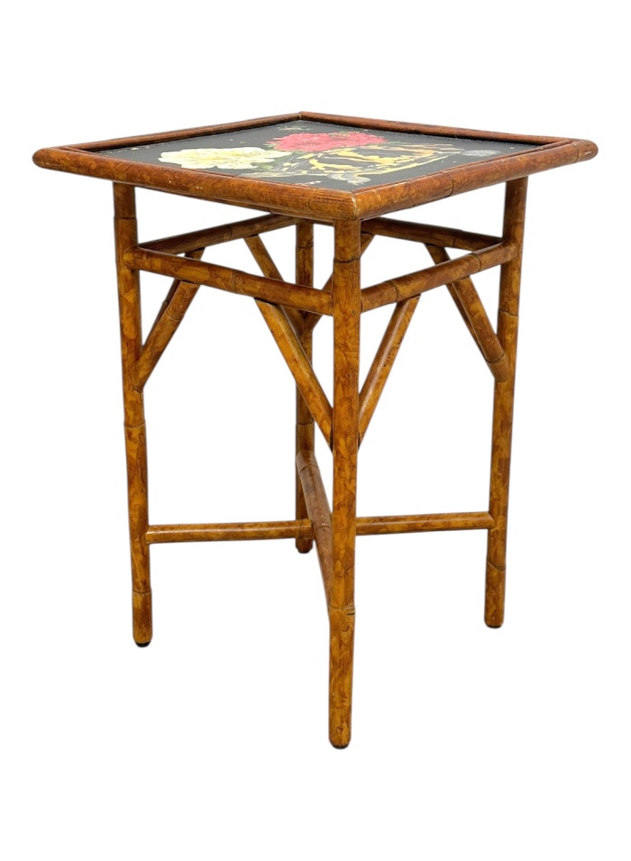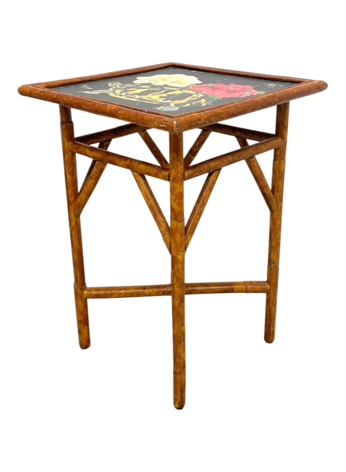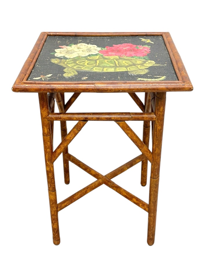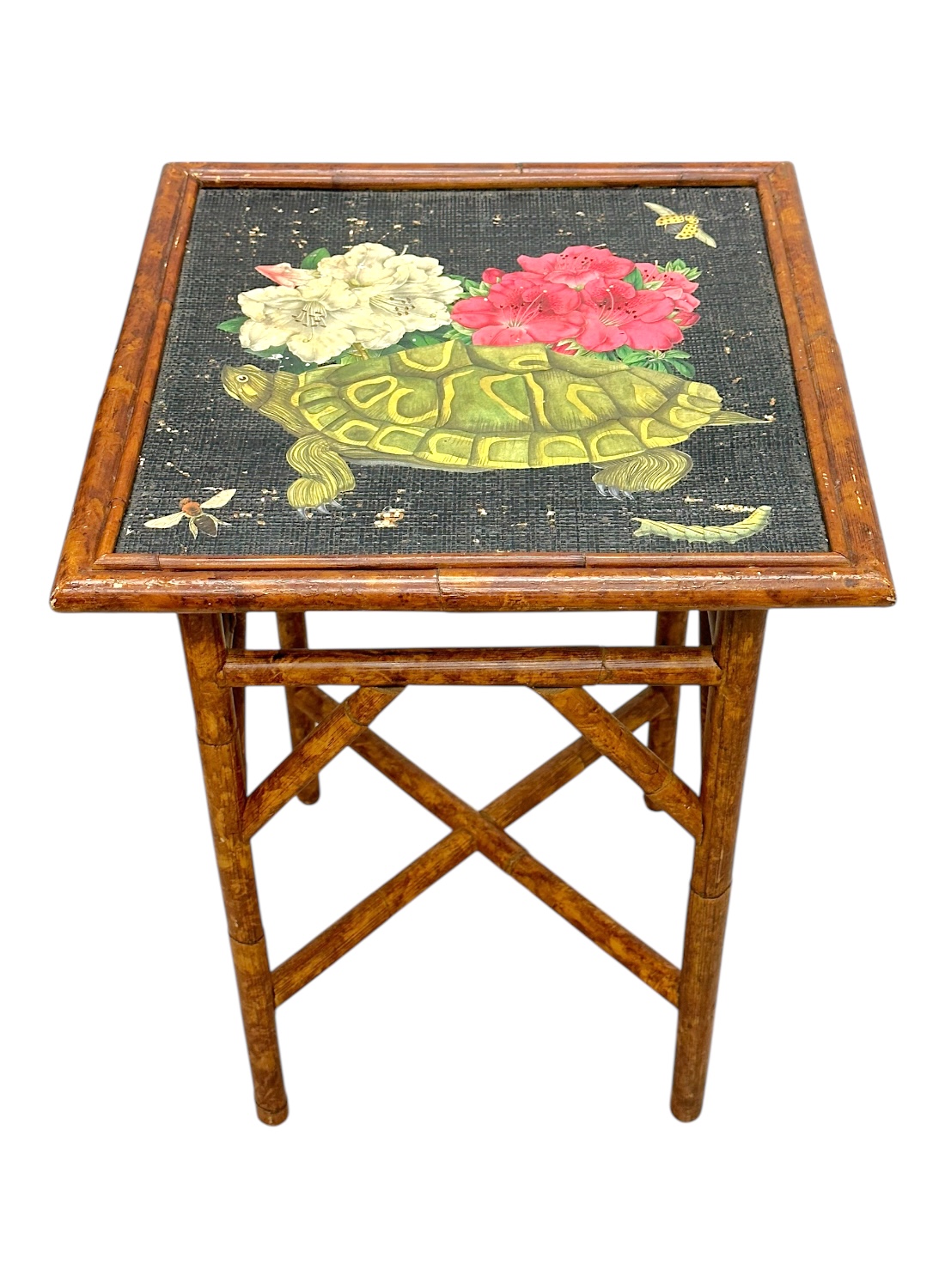 Vintage Bamboo Accent Table with Decoupage Turtle and Flower Top