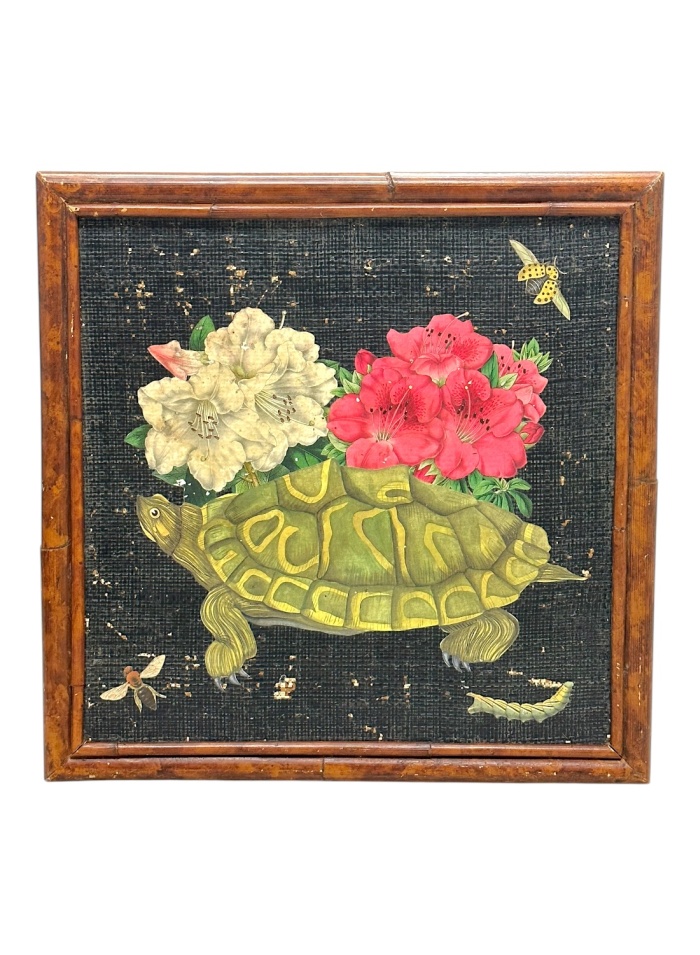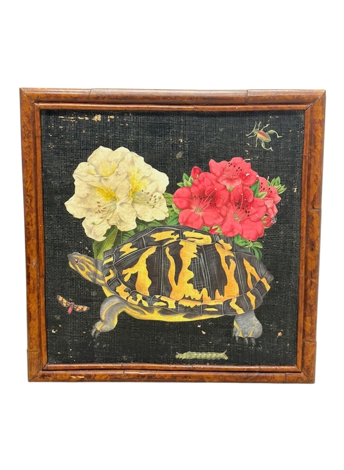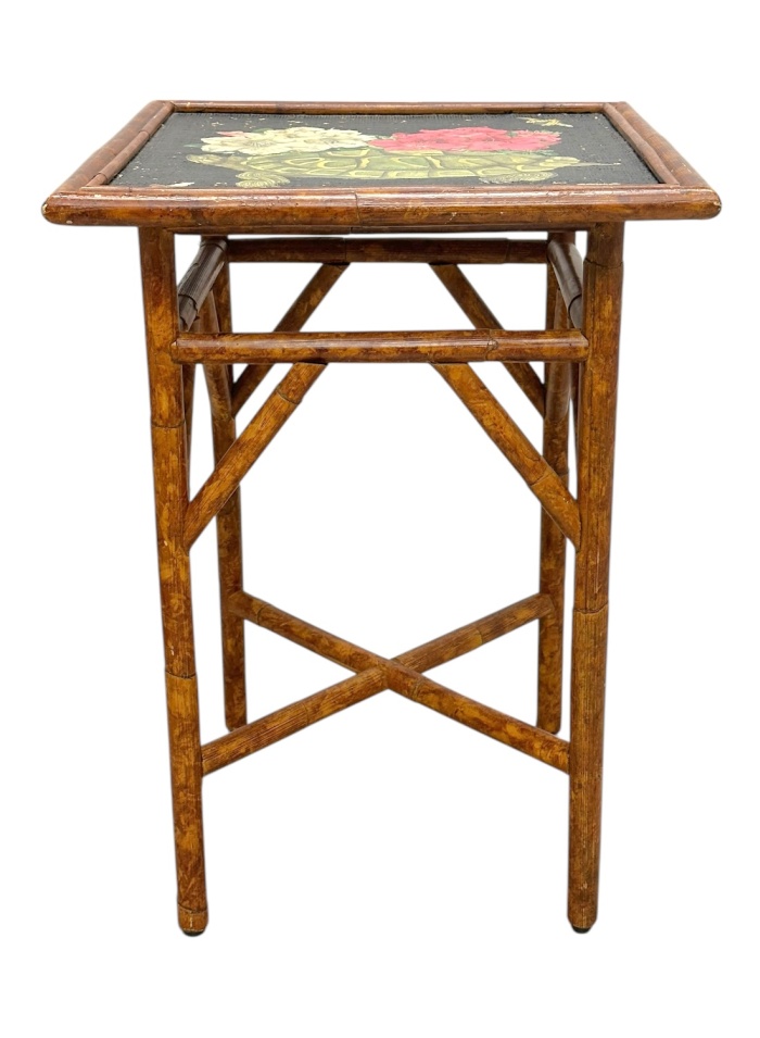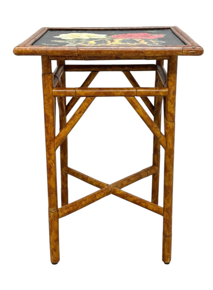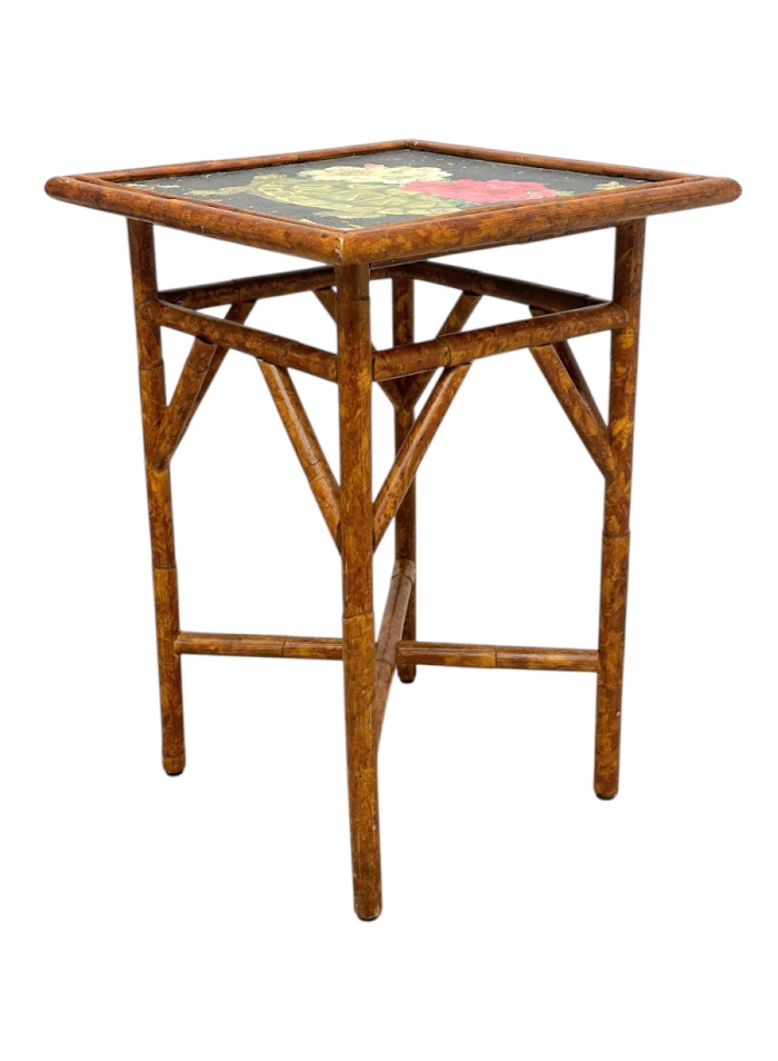Vintage Bamboo Accent Table with Decoupage Turtle and Flower Top