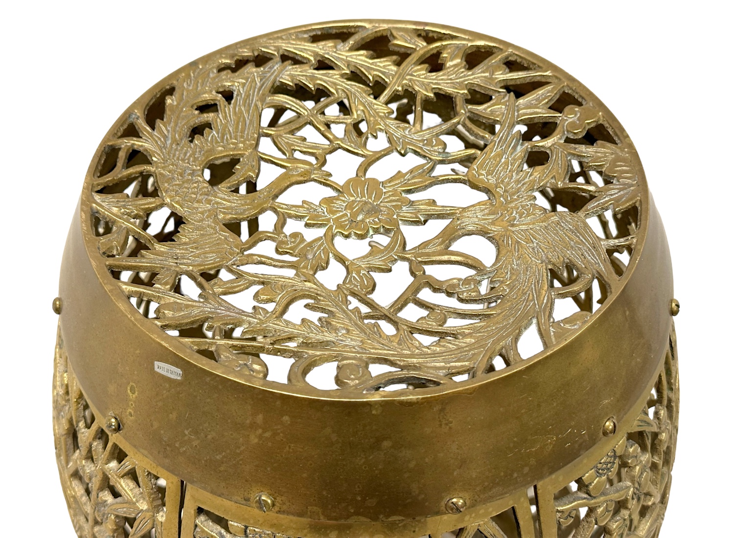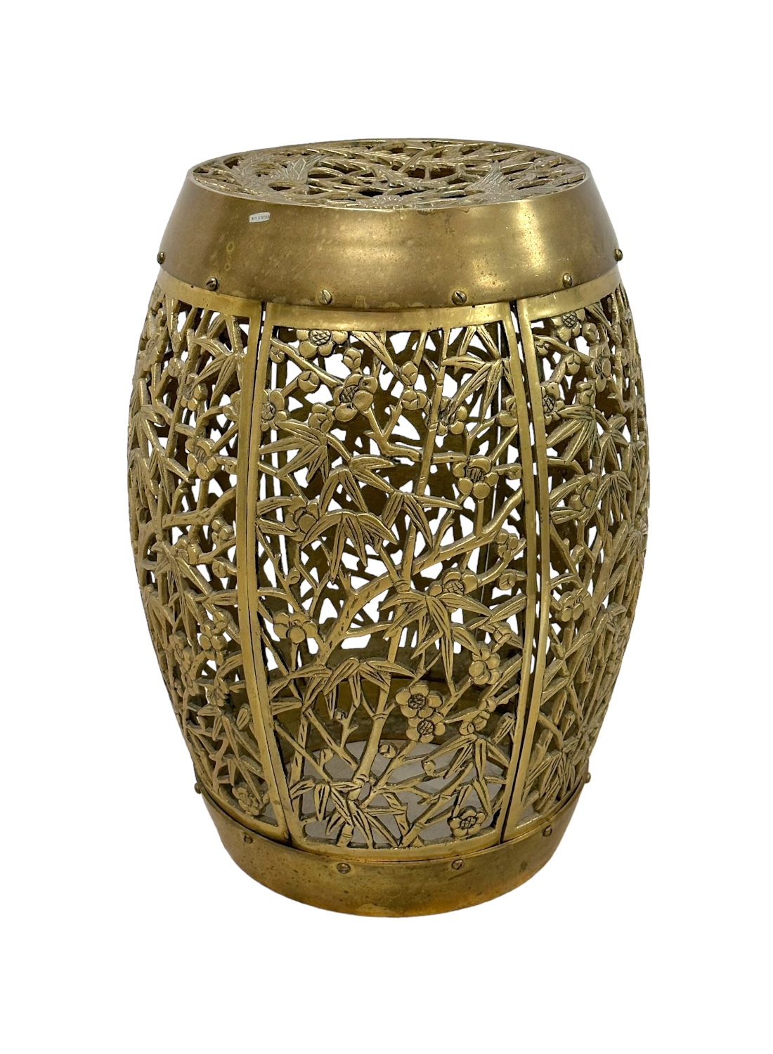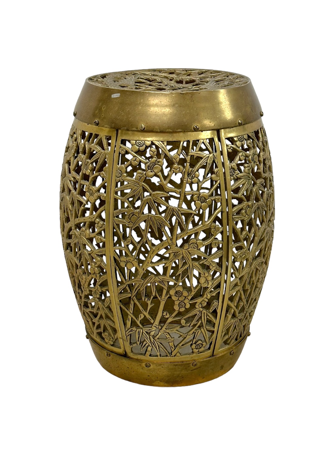 Round Vintage Brass Garden Stool with Intricate Floral Panel Decor
