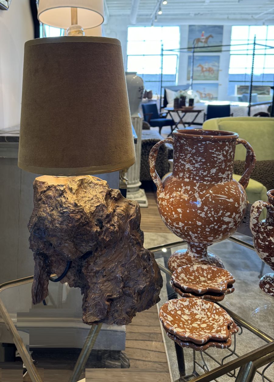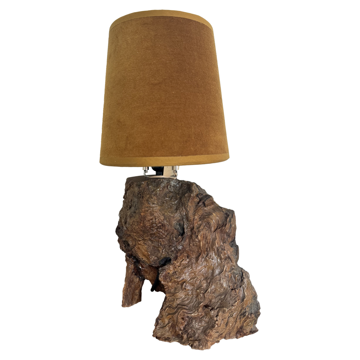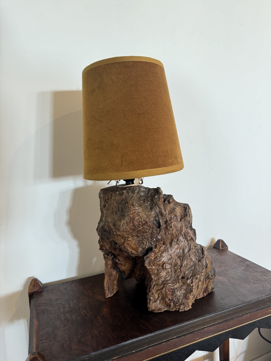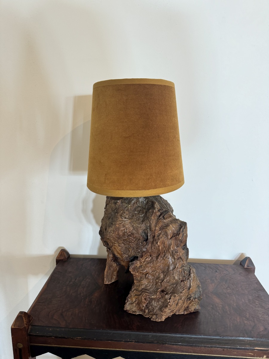 Vintage Wood Stump Lamp with Velvet Shade