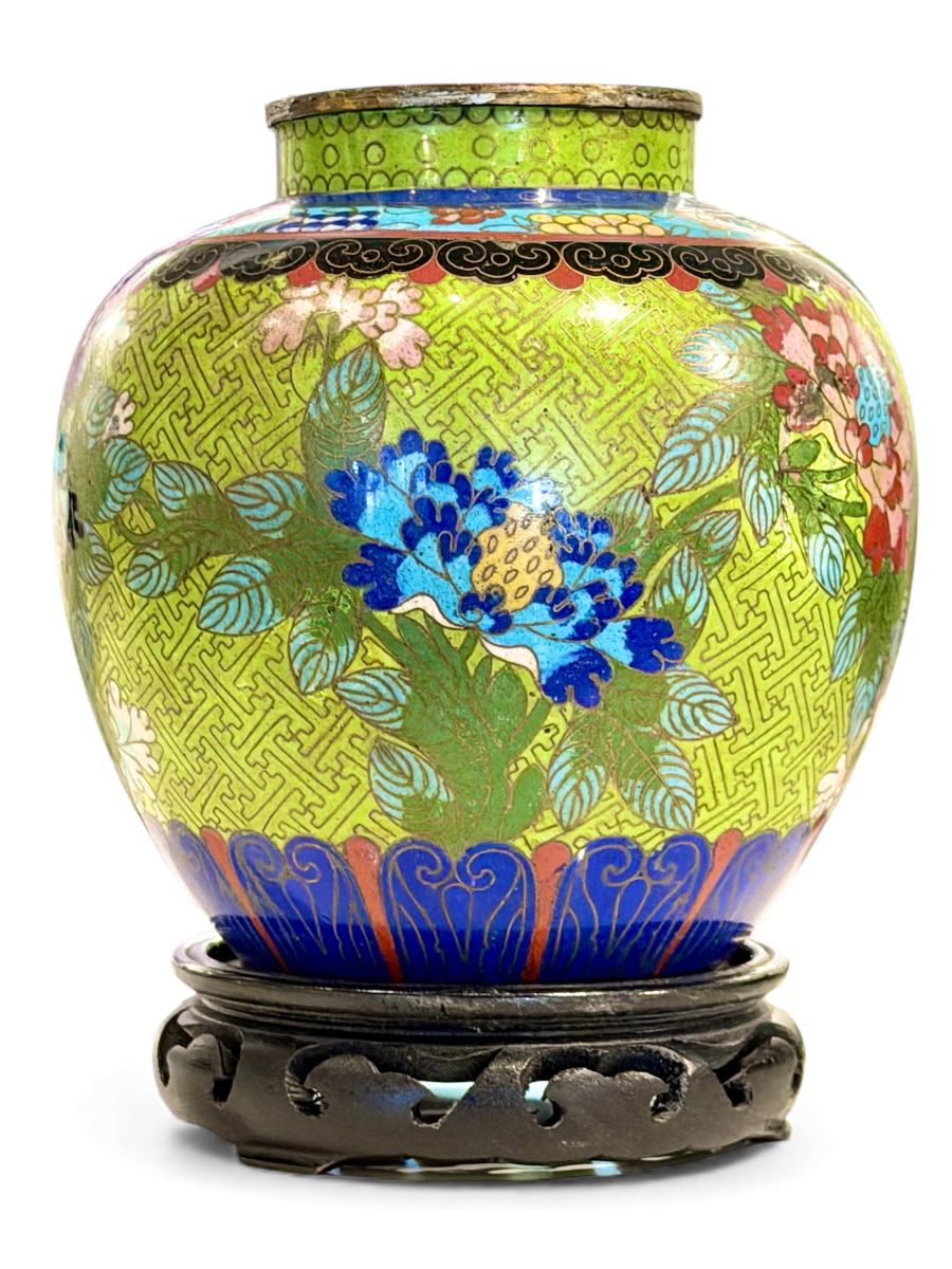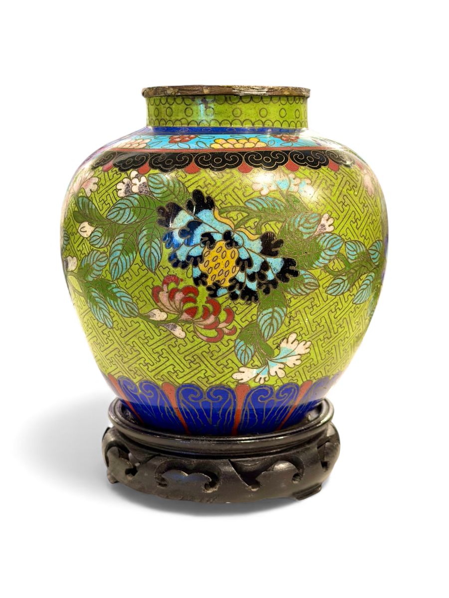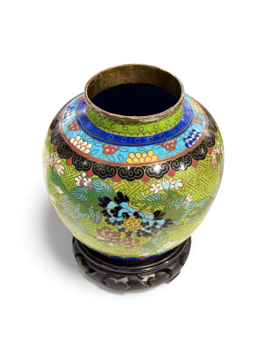 Vintage Fat Green Cloisonne Vase on Stand