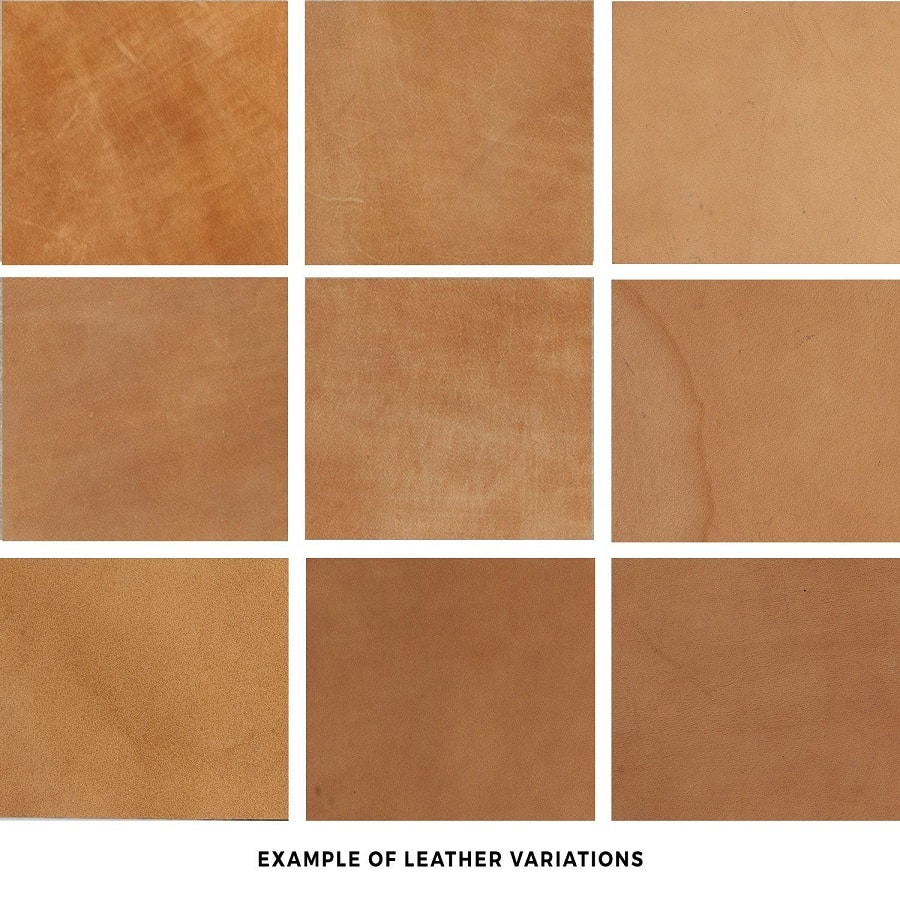 Made from natural cowhide leather that has multiple natural variations in color and texture with imperfection throughout the natural grain. Specific selections cannot be made for purchasing and leathers will vary. Please see variation examples.