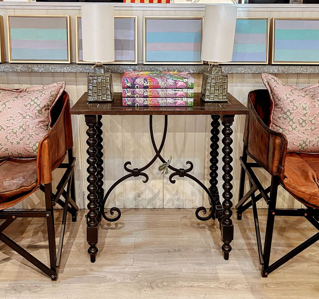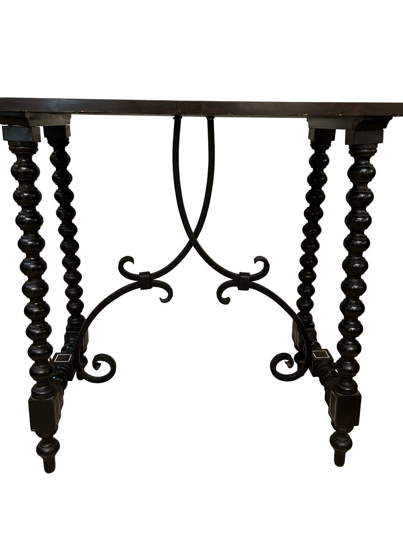 Antique Ebony Wood Console Table with Bone Inlay, Twisted Legs and Wrought Iron Stretcher