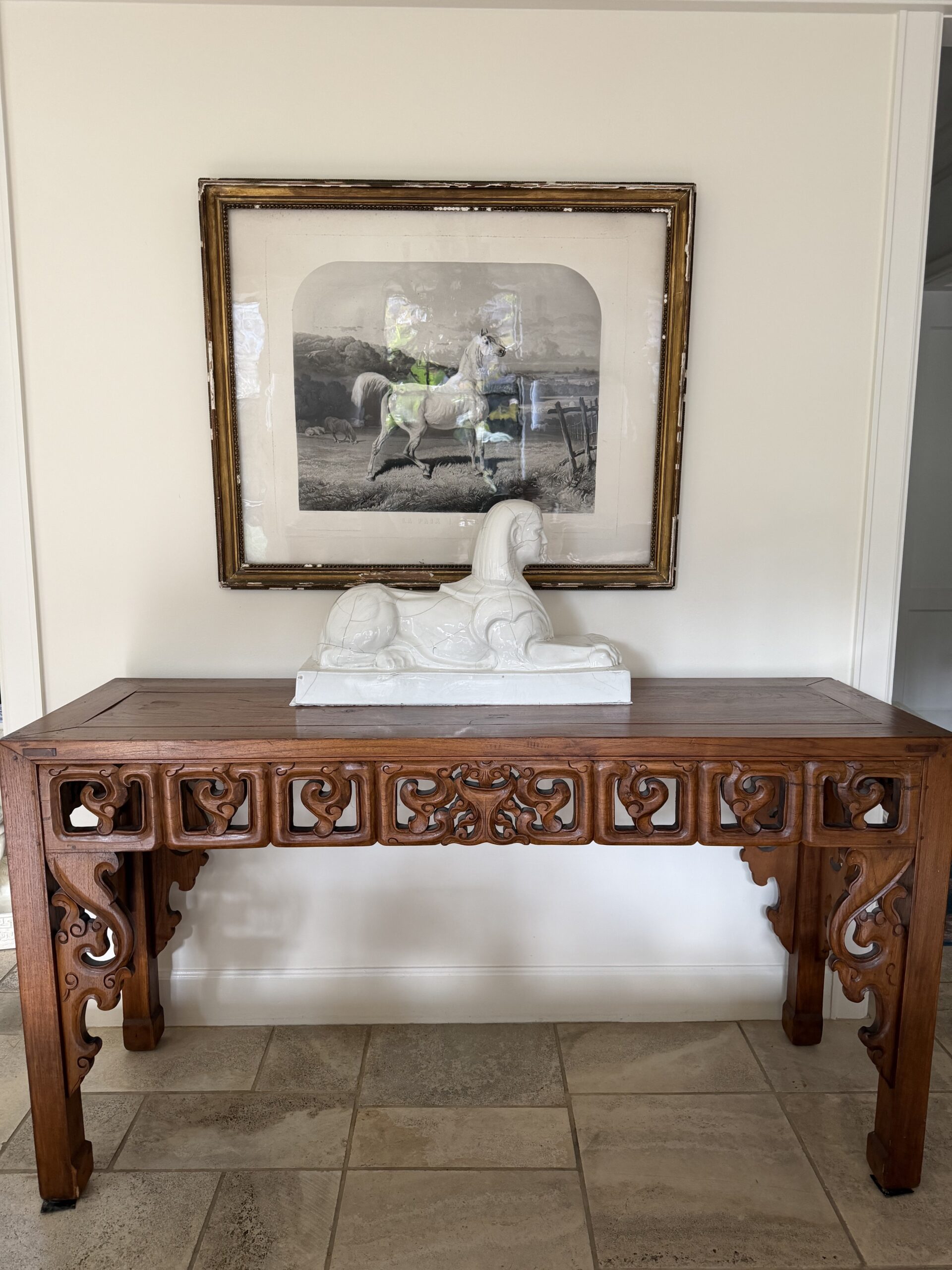 Mid 20th Century Rectangular Single Teak Middle Plank Top Console with Carved Scrolling Cloud Motif on All Sides on Four Legs with Carved Spandrels with Chow Feet