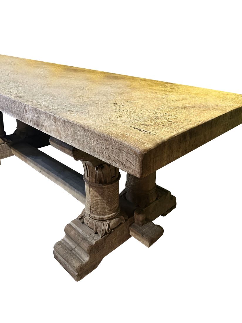 Antique Oak Console with Thick Top, Carved Balustrade Legs and Cross Stretcher, French