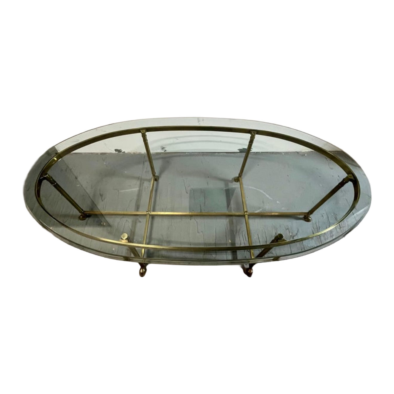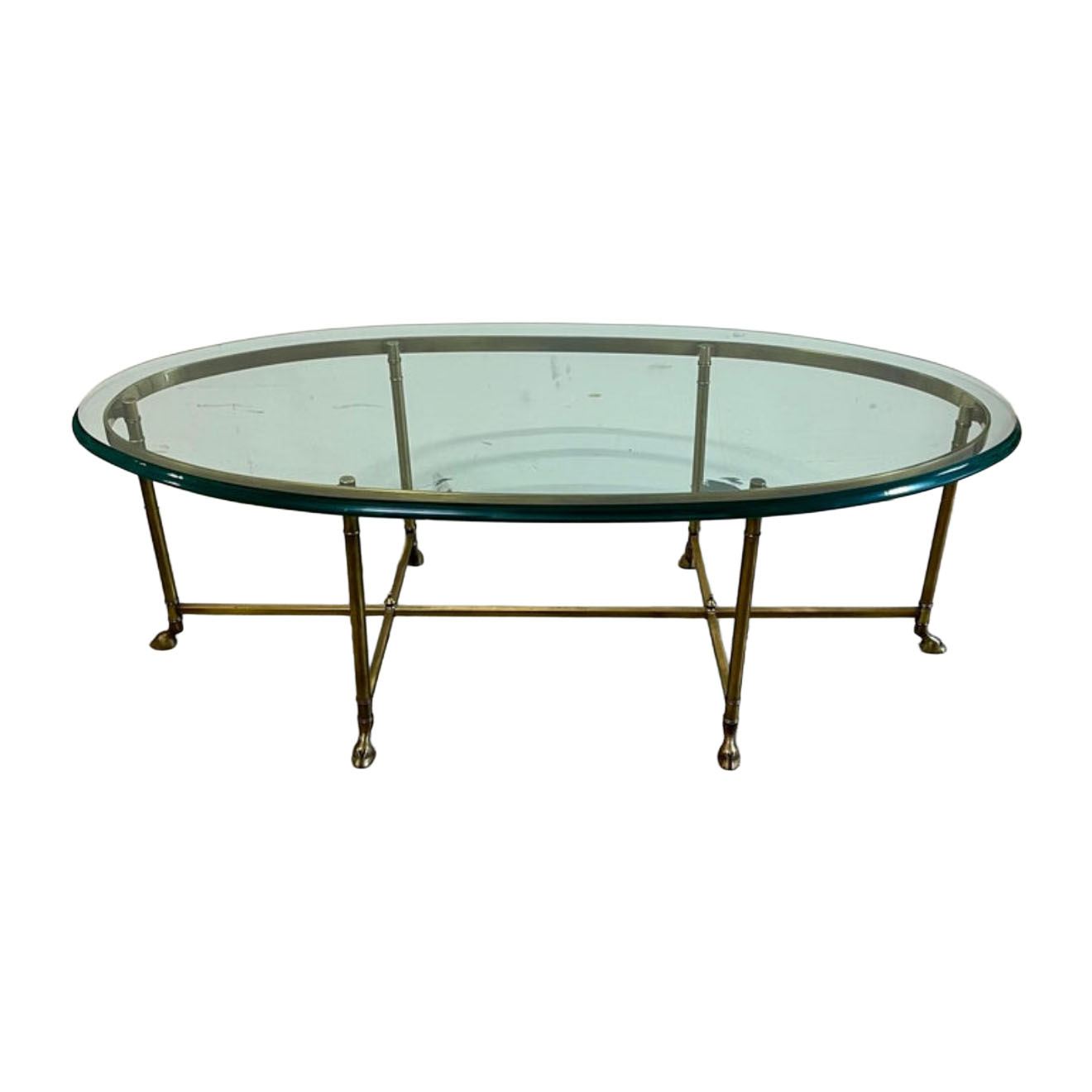 Vintage Mid-Century Oval Brass and Glass Cocktail Table with Hoof Feet