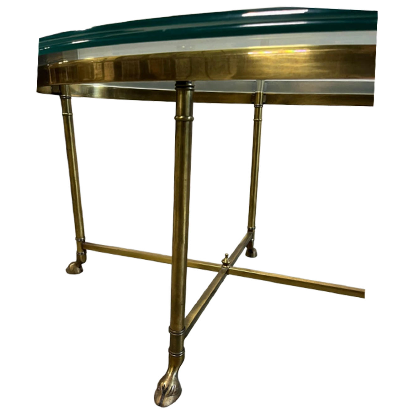 Patinated Brass Base with Bottom Stretcher and Four Hoof Feet Legs and Thick Oval Bevelled Glass Top Supported by Six Brass Legs on Stylized Brass Hoof